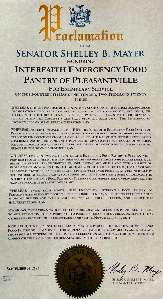 The Interfaith Emergency Food Pantry of Pleasantville is affiliated with faith-based congregations in the community. It has been in operation since the mid-1980’s and began as a place where neighbors could help their neighbors in need. This tradition continues today.